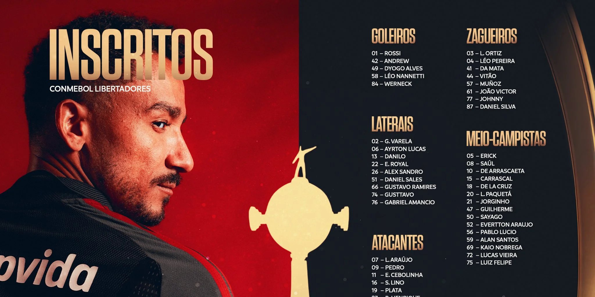 O Flamengo entregou à Conmebol a lista com 50 atletas que defenderão o clube na fase de grupos da Copa Libertadores 2026. O elenco inscrito reúne cinco goleiros, oito zagueiros, nove laterais, 15 meio-campistas e 13 atacantes. Entre eles, 19 jovens aparecem como novidades, muitos ainda sem presença frequente no time principal comandado por Leonardo Jardim.