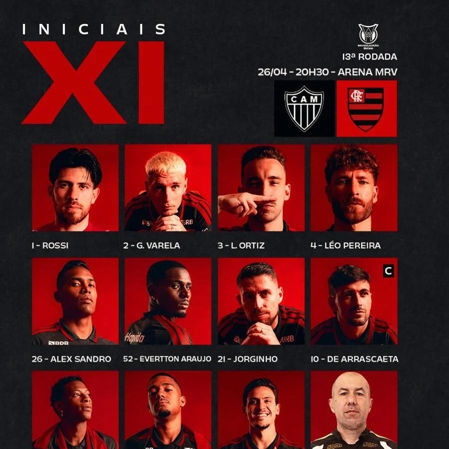 O Flamengo divulgou a formação titular para o duelo contra o Atlético-MG, marcado para as 20h30 deste domingo (26), na Arena MRV, em Belo Horizonte, pela 13ª rodada do Campeonato Brasileiro. A principal novidade é o retorno de Jorginho, recuperado de lesão muscular, que volta a iniciar uma partida após quase dois meses.